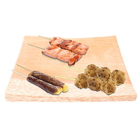 2 Yakitori boulettes de poulet, 2 yakitori saumon, 2 yakitori boeuf fromage + Wasabi, gingembre + 2 Accompagnements au choix.