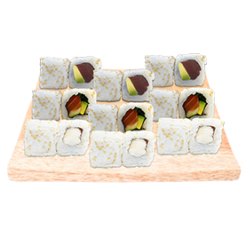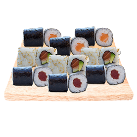 6 California saumon avocat, 6 maki algues thon, 6 maki algues saumon + Wasabi, gingembre + 2 Accompagnements au choix.