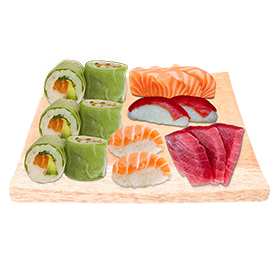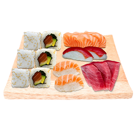 2 Sushi saumon, 2 sushi thon, 2 sashimi thon, 3 sashimi saumon, 3 california saumon avocat, 3 california thon avocat + Wasabi, gingembre + 2 Accompagnements au choix.