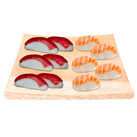 2 Sushi saumon, 2 sushi thon, 2 sashimi thon, 3 sashimi saumon, 6 maki primeur saumon avocat + Wasabi, gingembre + 2 Accompagnements au choix.