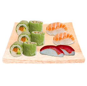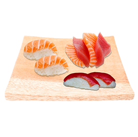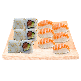 2 Sushi thon, 3 sushi saumon, 2 sashimi thon, 2 sashimi saumon + Wasabi, gingembre + 1 Entrée au choix + 1 Boisson 33cl au choix.