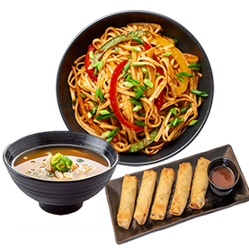 Nouilles au choix + 4 Nems au choix + Wasabi, gingembre + 1 Entrée au choix + 1 Boisson 33cl au choix.